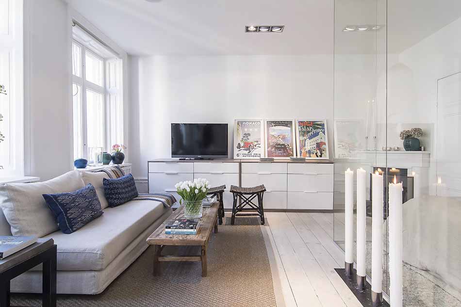 The first interior you are likely to observe upon entering this apartment is the bedroom, creatively separated from the rest of the project through glass walls. Pebbles under the bed, a giant mirror and framed graphics contribute to the Scandinavian personality of this space. The living zone, kitchen and dining table are organized in an open layout. And when it comes to Scandinavian apartments, an irresistible terrace is a must. In this case, the small balcony extends living spaces, creating a charming venue for having coffee and breakfast during warm summer mornings.